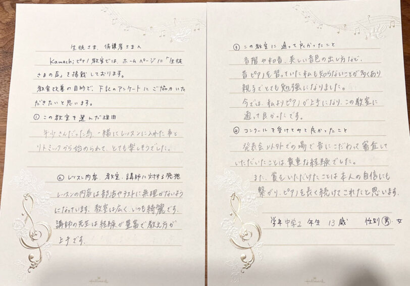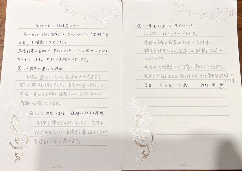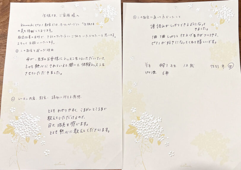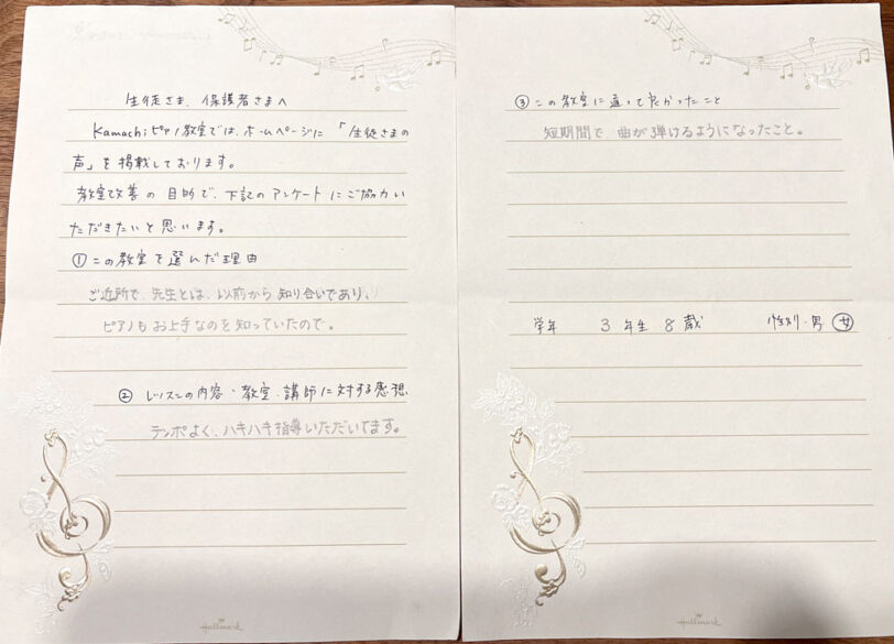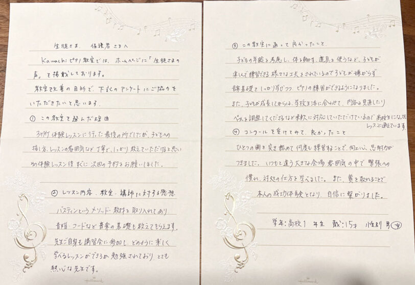 この教室に通うまでは、自己流に弾いていたところもあり、基礎をしっかり教えて頂くことで、難しさを感じながらも楽しみながらピアノを弾いてくれているので良かったです。