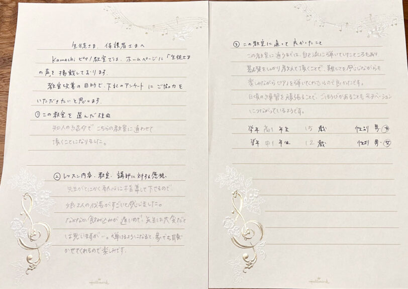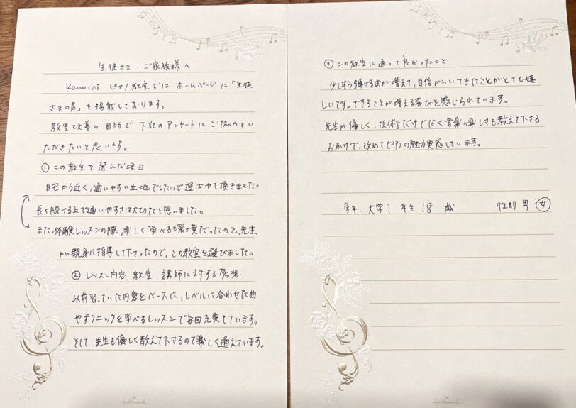 また、子どもが成長してからは学校生活に合わせて、内容を見直したりペースを調整してくださるなど柔軟に対応していただけているので高校生になってもレッスンに通えています。
