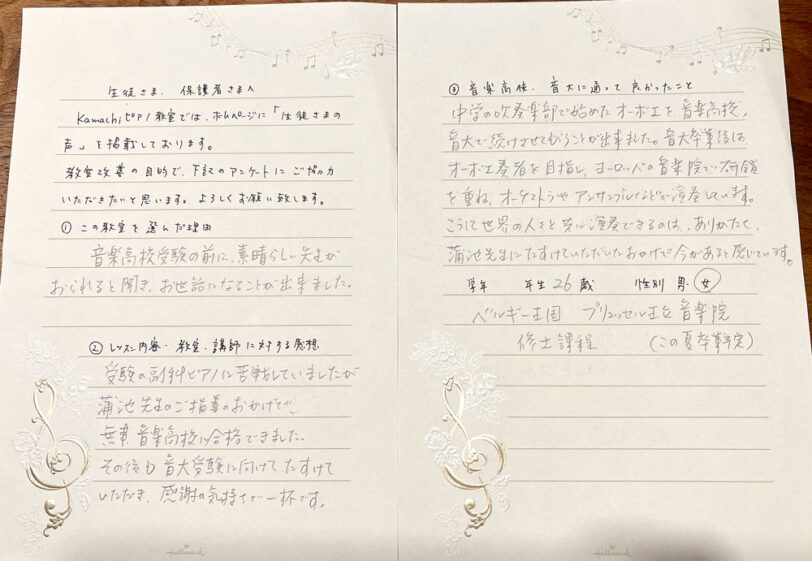 受験の副科ピアノに苦戦していましたが蒲池先生のご指導のおかげで、無事音楽高校に合格できました。その後も音大受験に向けてたすけていただき、感謝の気持ちで一杯です。